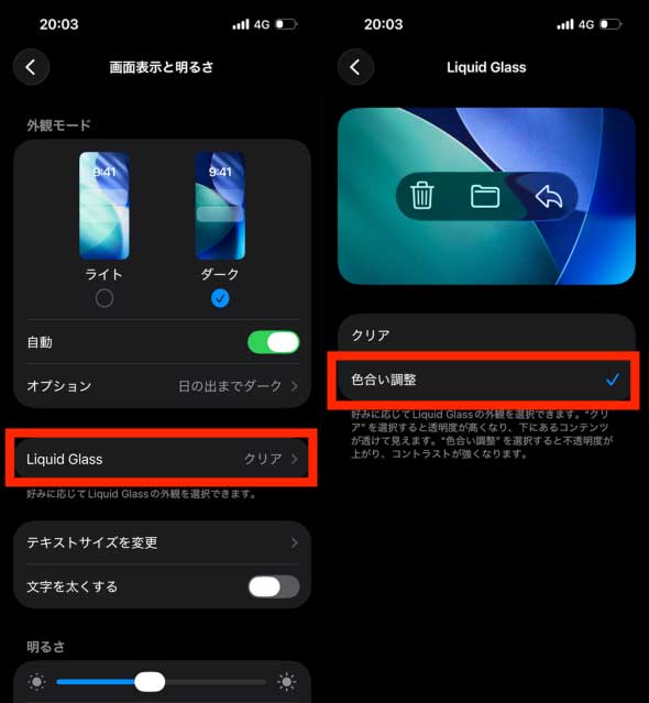 具体来说,在同一屏幕上点击“液态玻璃”项,然后在下一个屏幕上选择“清晰”和“色调调整”两个选项。